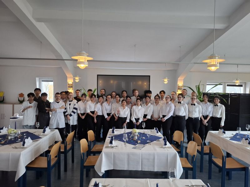 Unter fachkundiger Anleitung der beiden Lehrkräfte Frau Blümel und Herr Huster übten die Azubis des 3. Lehrjahres für ihr praktisches Examen im Bereich Koch und Restaurant.